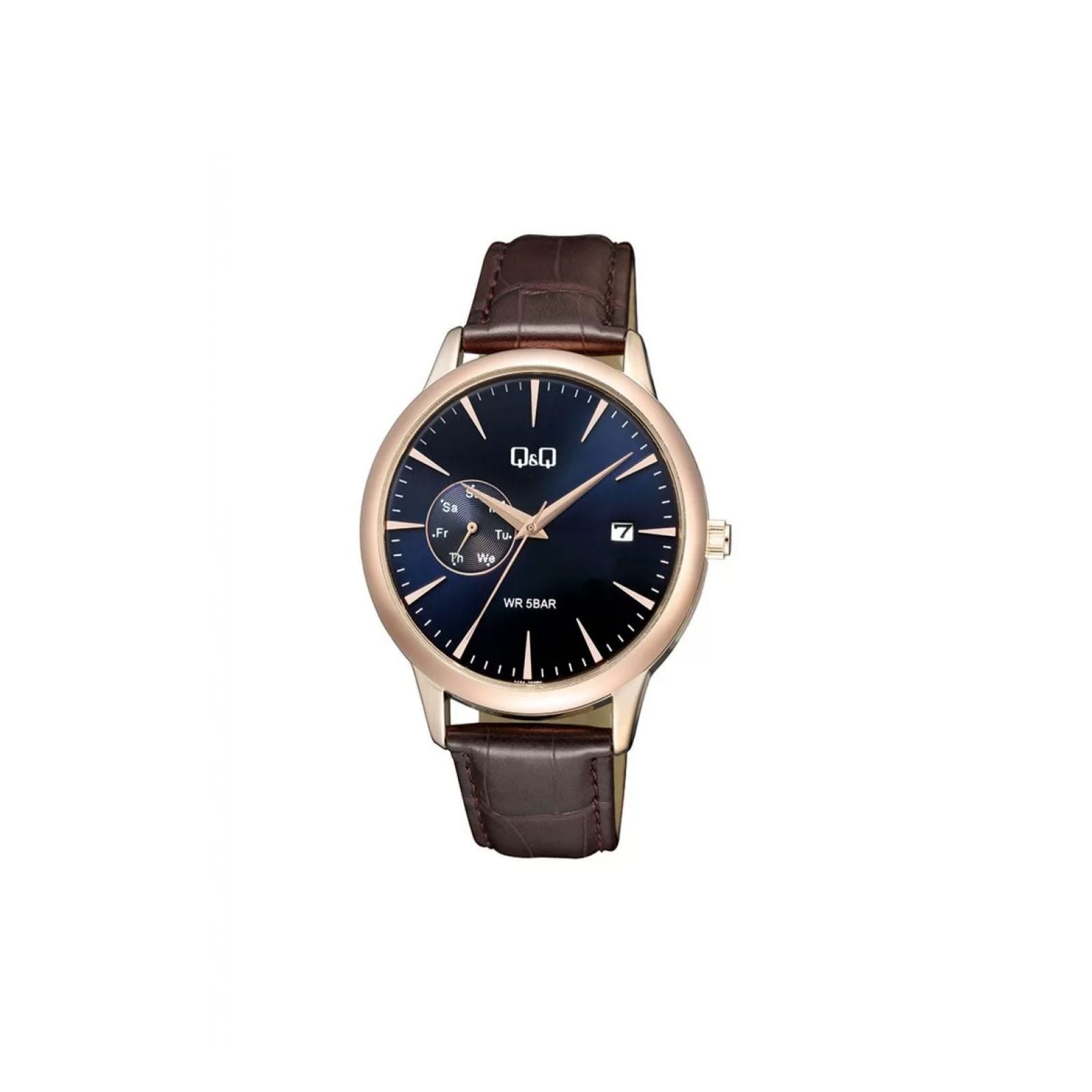 - ShortDescription: Reloj Q&Q A12a-003py a12a para hombre, tamaño de la caja 42 de acero inoxidable, tamaño del pulso 220 de cuero, color marrón, ancho del pulso de 20 , resistencia al agua hasta 50 metros.