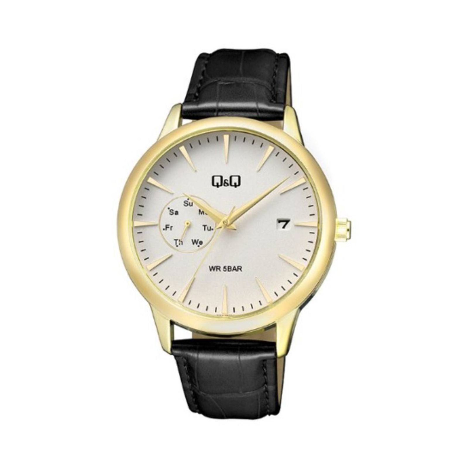 Reloj q&q a12a-005py a12a para hombre, tamaño de la caja 42 mm de acero inoxidable, tamaño del pulso 220 mm de cuero, color negro, pulso de 220 mm, resistencia al agua hasta 50 metros