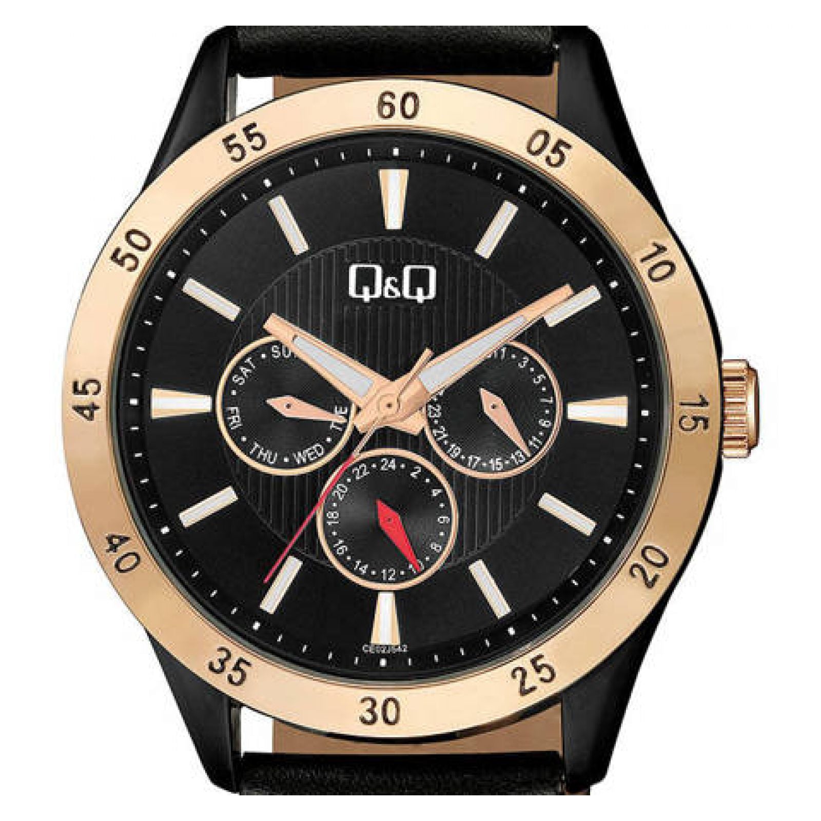 Reloj q&q ce02j542y classic para hombre, tamaño de la caja 44 mm de acero inoxidable, tamaño del pulso 220 mm de cuero, color negro, pulso de 220 mm, resistencia al agua hasta 50 metros