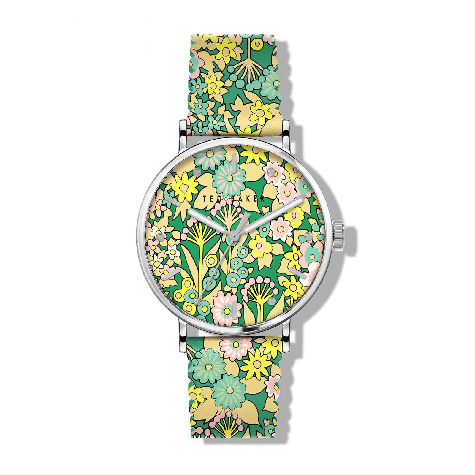 - ShortDescription: Reloj Ted Baker con caja y bisel en acero inoxidable, extensible tipo correa en piel multicolor con flores, carátula con manecillas, indicadores y nombre de la marca.