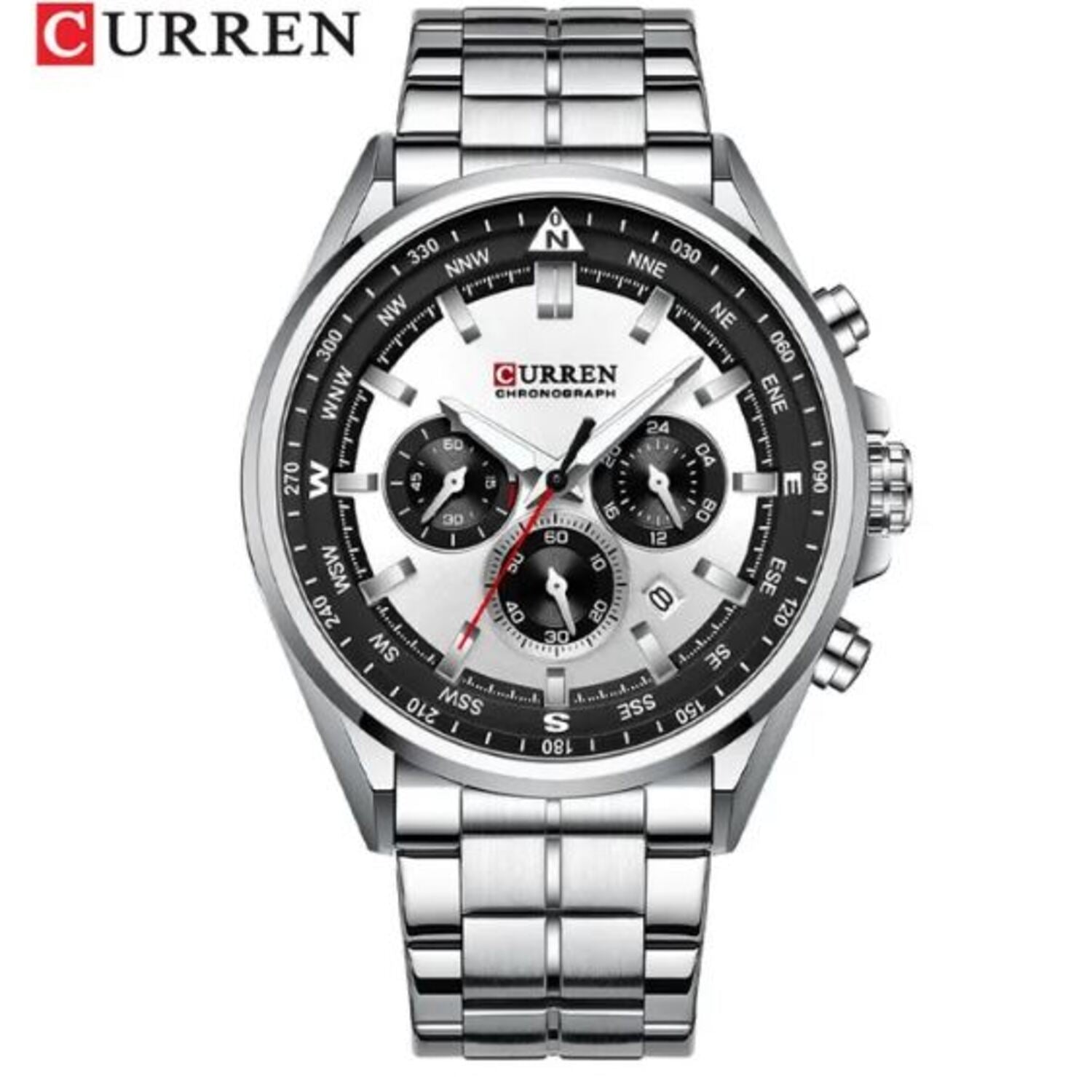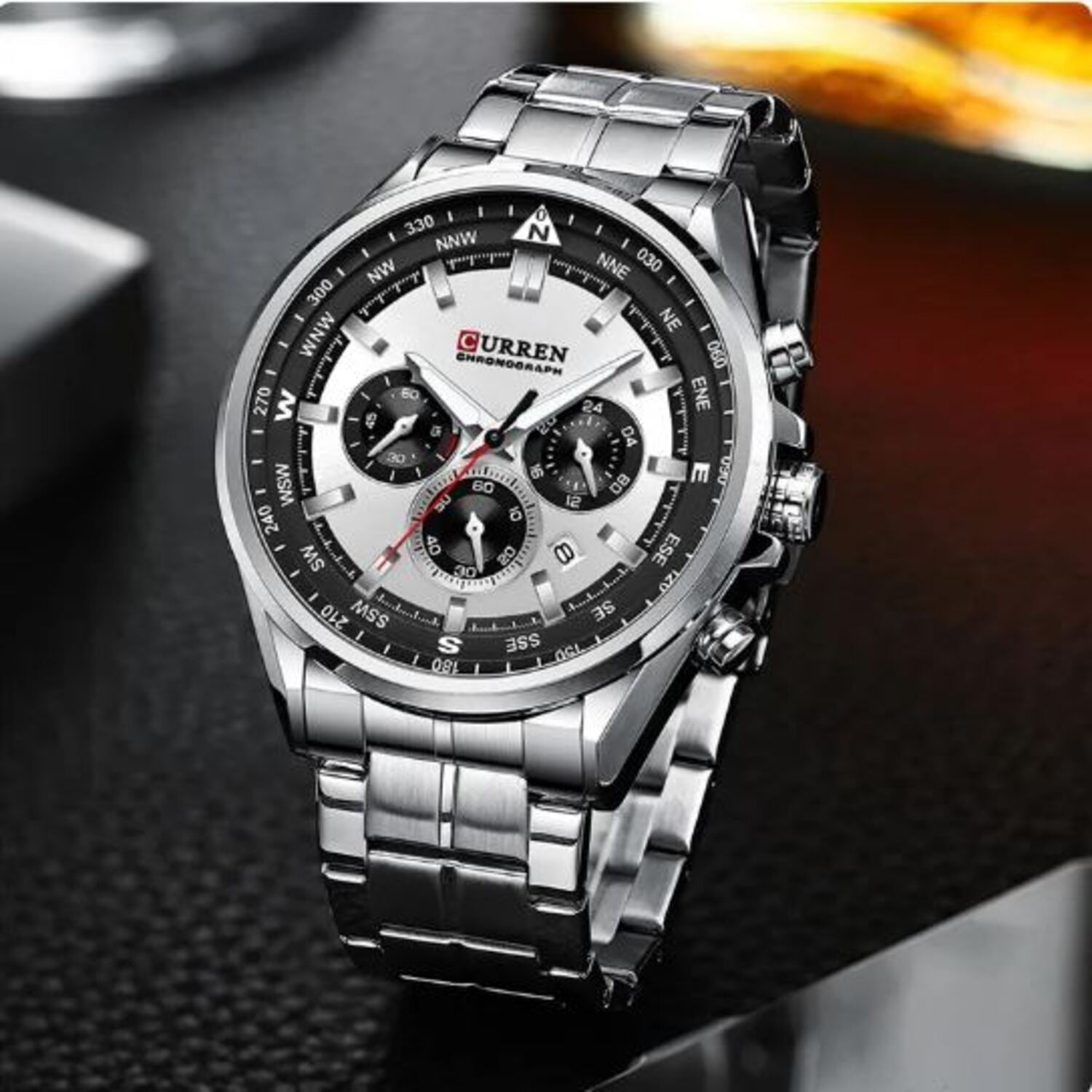 - ShortDescription: Reloj para hombre marca Curren de la colección 8399, con caja de 48mm y banda 24x240mm de acero inoxidable plateado, tablero blanco, con cronografo y calendario, resistencia al agua de 30m y una belleza y elegancia que exude refinamiento y éxito.