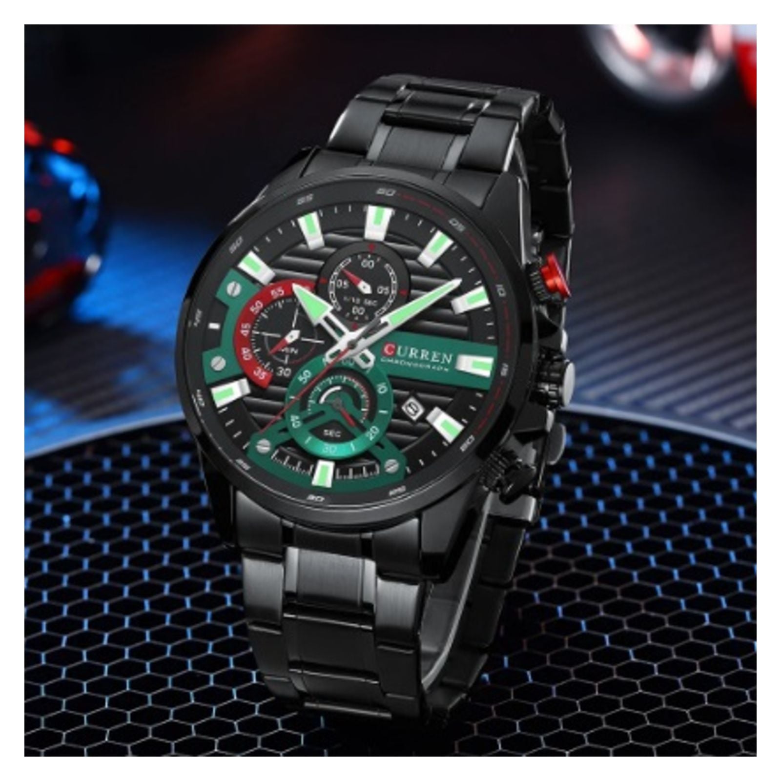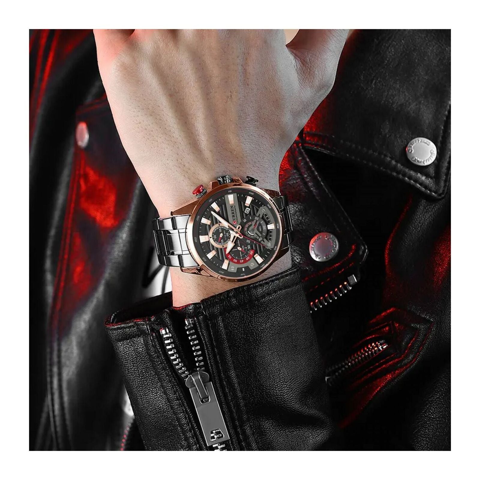 Curren tiene una amplia gama de relojes y que en su mayoría apuntan a los relojes sofisticados. Está hecho con una tecnología innovadora y de alta precisión que proporciona el tiempo de mantenimiento en comparación con los demás viene grabados en la parte superior e inferior con su logo, igualmente en la hebilla y con una etiqueta atada a un extremo del reloj que los identifica.