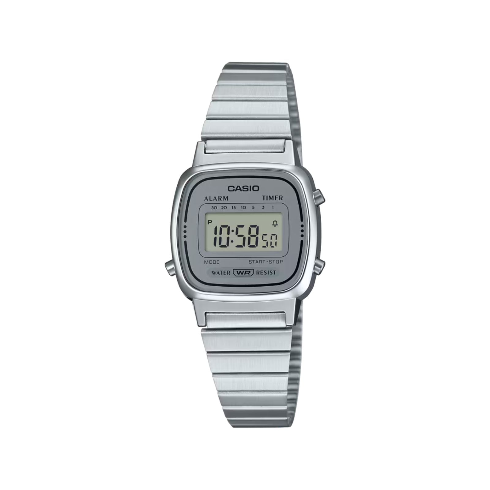 Reloj casio la-670wa-7 para unisex, tamaño de la caja 30 mm de acero inoxidable, tamaño del pulso 15 mm de acero inoxidable, color plateado, pulso de 15 mm, resistencia al agua hasta 30 metros